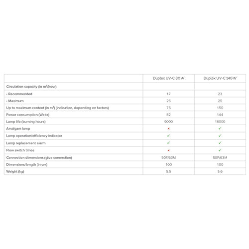 Model Xpert 140?W is equipped with an amalgam lamp, the strongest UV-C light whose efficiency is influenced by temperature fluctuations. Equipped with flow switch which switches off the lamp when the flow is too low. Proper grounding is important.