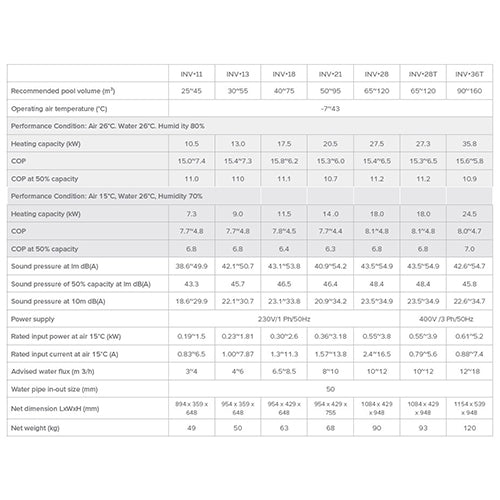 The Full-Inverter® heat pump cuts running costs in half and operates more quietly throughout the swimming season based on average power. At the start of the season, the heat pump operates at 100% power to heat the pool as quickly as possible during the first few days. After that, the full-inverter heat pump runs at an average of 50% of the power to maintain the desired pool temperature.