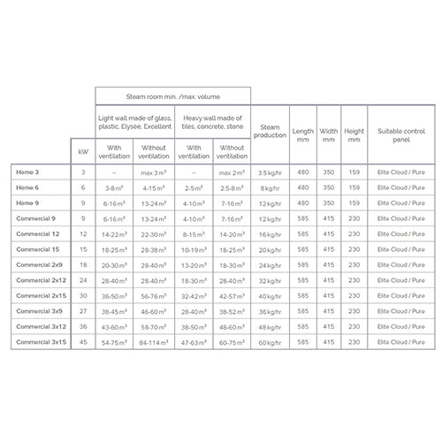 Together with the Elite Cloud control panel, this generator gives you total control of a steam system. Two-way communication between the control panel and the steam generator means that the output can be automatically adjusted to the volume of the steam room, for the most efficient heating.